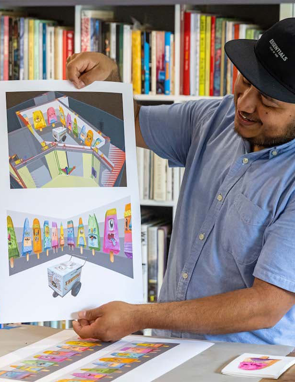 “My project at Meow Wolf will be a room surrounded by paletas, which is another word for popsicles. In the neighborhoods like Oak Cliff in Dallas, TX we have paleta vendors who come by pushing a cart or riding a bike. You can stop them and buy this treat, the popsicle. The idea of a vendor coming to your neighborhood to allow you enjoy these treats is special. Sometimes it offers not only a break from the heat, but also a break from the struggles that we have in our neighborhoods. Several years ago, there was a paleta vendor who was murdered in Dallas near my home. I was heartbroken by the thought that even in the community that we see as innocent, vendors have to endure such struggles. I took it upon myself to take the memory of not only this vendor, but other vendors, immigrants, hardworking people or anyone who felt left out, and I represent them through these images of popsicles. I make them more bright, more colorful; I give them faces. My goal is to turn something negative into positive...”